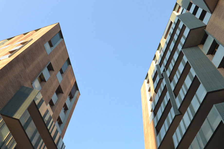 From a project by CINO ZUCCHI ARCHITETTI, the materials selected for the construction of the two 9-floor and 13-floor buildings with unique architectural characters and volumes are connected with nature, starting from the entrance hall, identified by green porphyry slabs, oak panelling and many more details. The outside is characterized by materials with great personality such as corrugated and perforated sheet, exposed bricks, stones and sand-blasted glass.